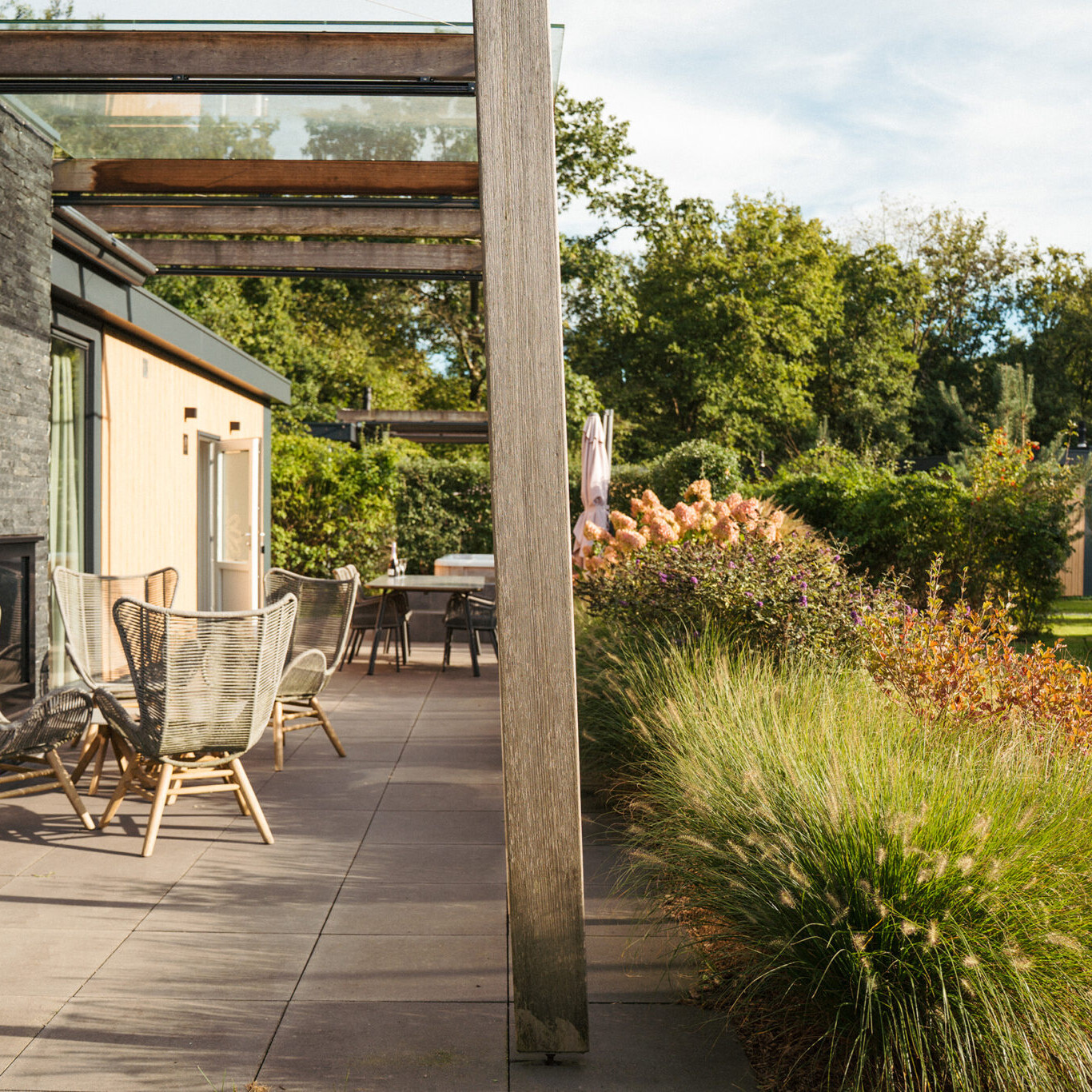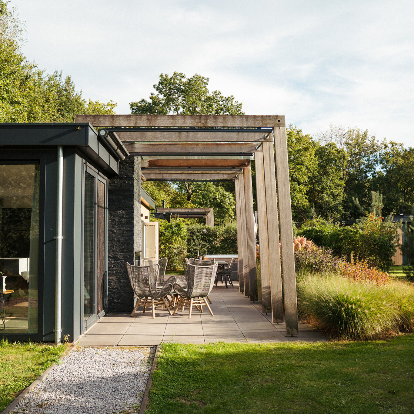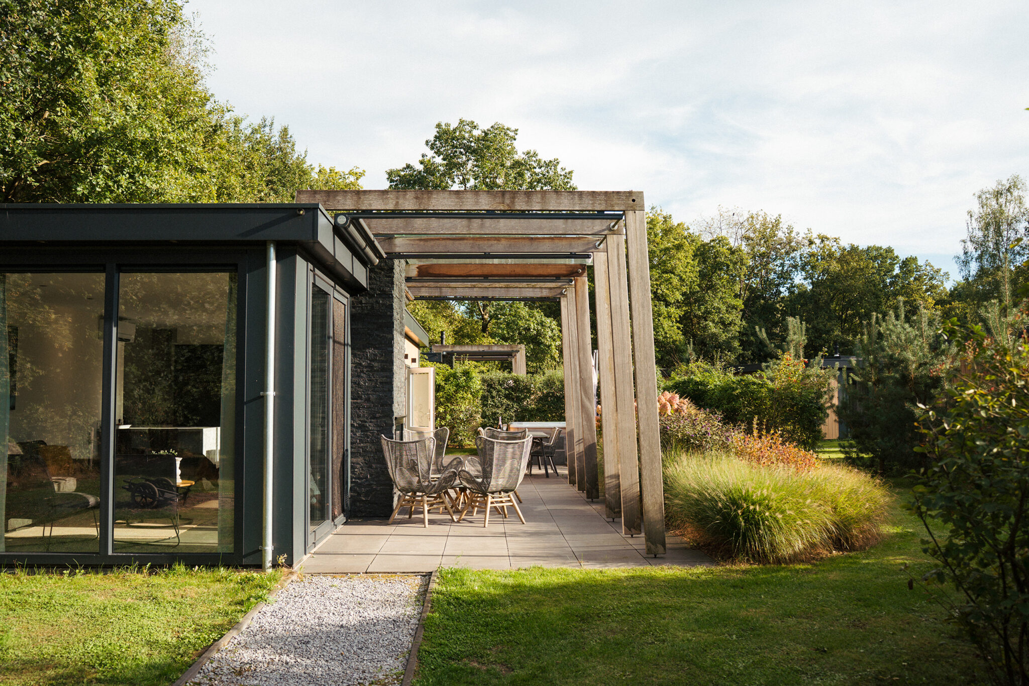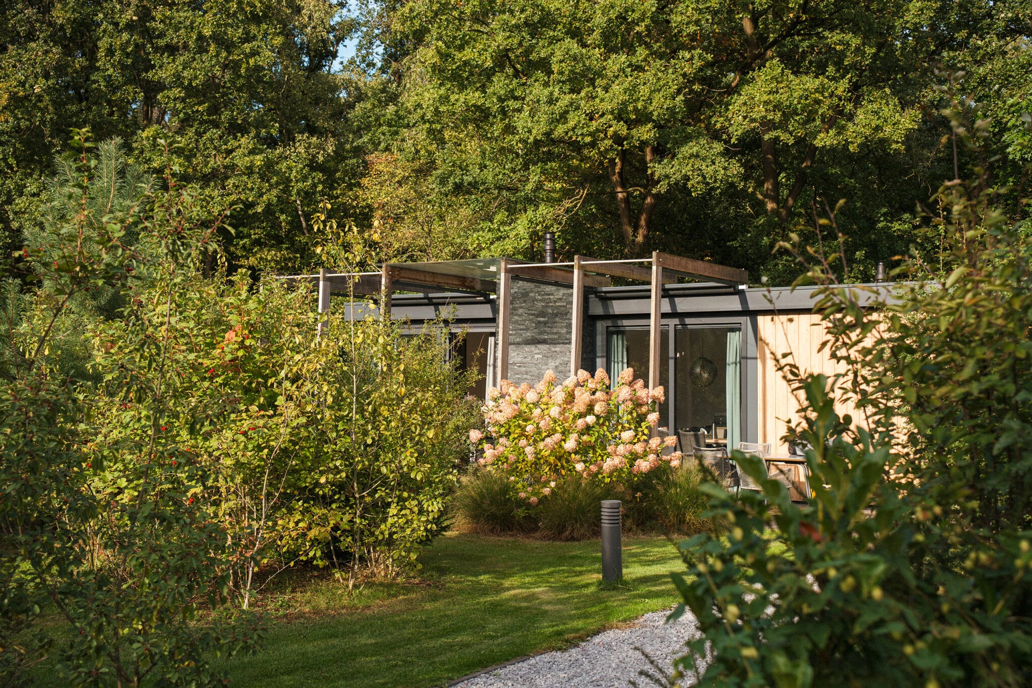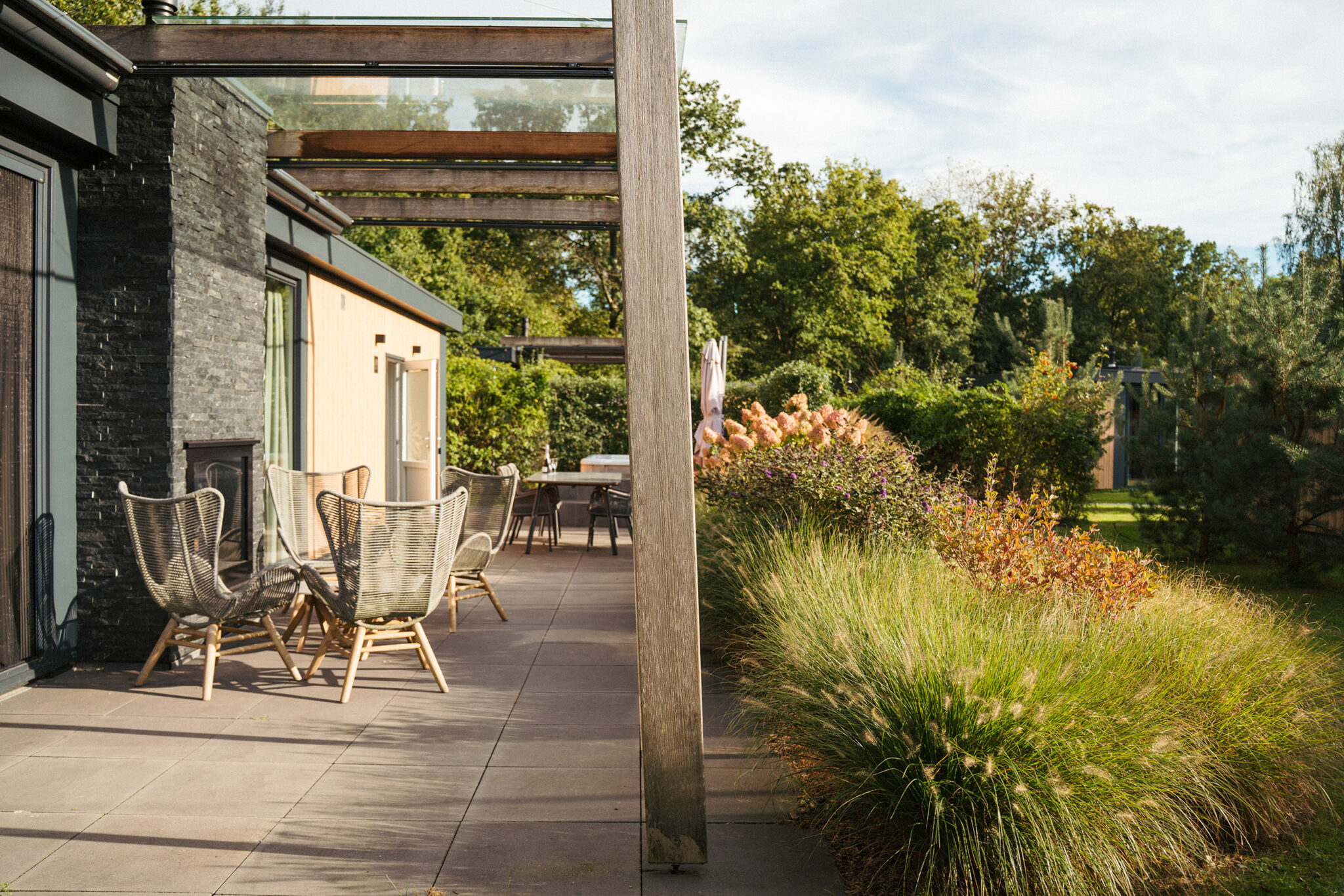 Veel aandacht is er besteed aan de inrichting en uitrusting van de lodge, terras en aanleg van de tuin. Heerlijk op het terras bij de binnen / buiten haard. Wordt het te koud? Laat het vuurtje branden en ga binnen lekker verder met waar je mee bezig was. Zorgvuldig gekozen meubels en accessoires dragen bij aan een luxe en eigentijdse sfeer van de lodge. Plafondspots en indirecte verlichting zorgen zowel binnen als buiten voor een warme ambiance.