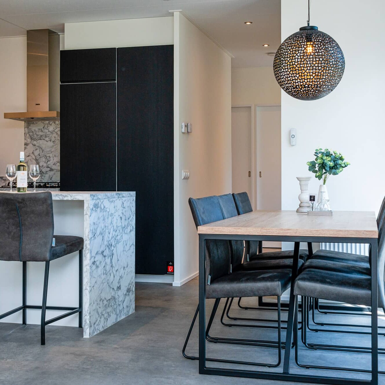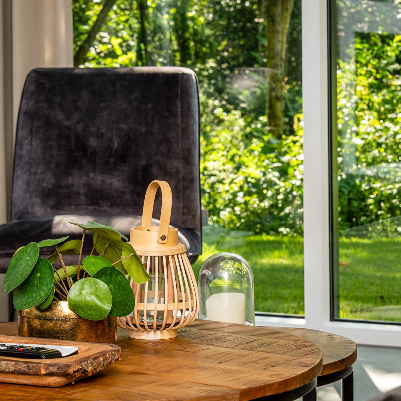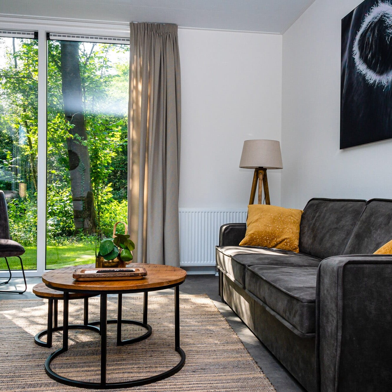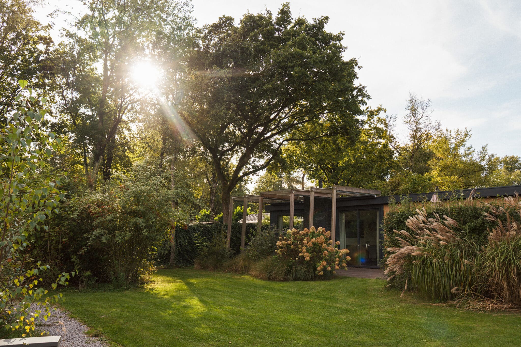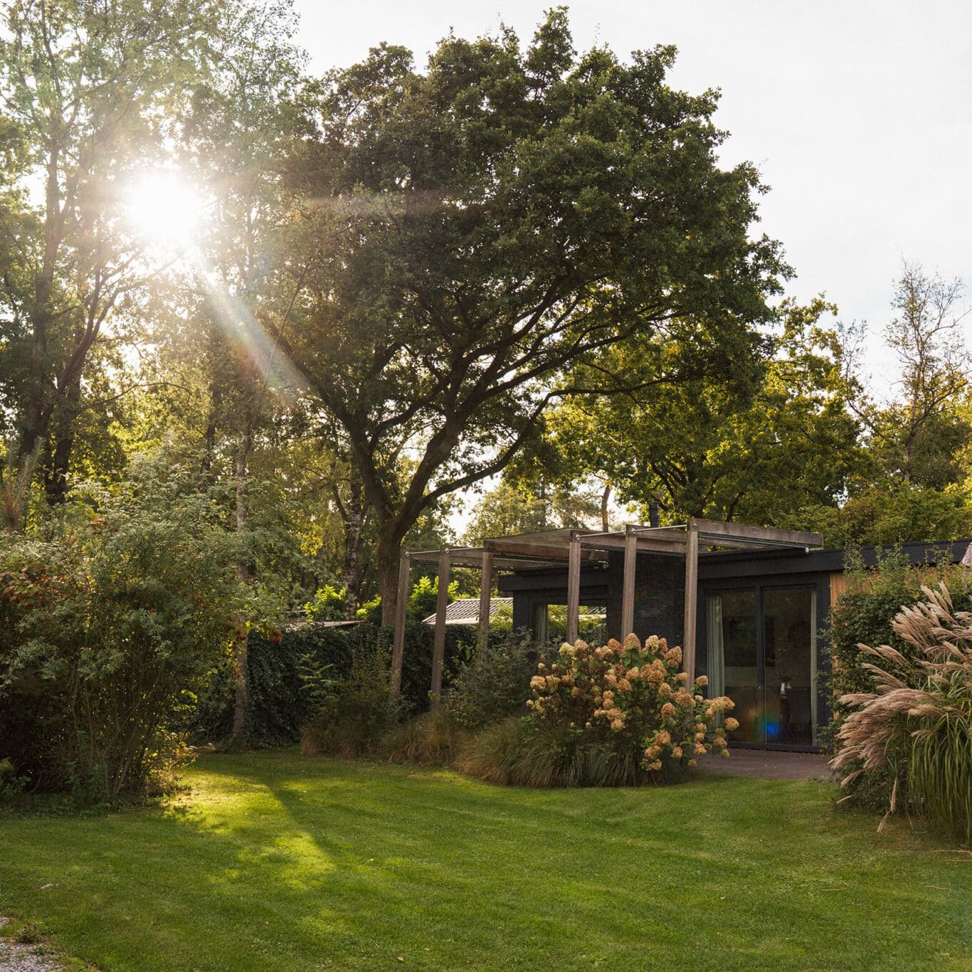 Veel aandacht is er besteed aan de inrichting en uitrusting van de lodge, terras en aanleg van de tuin. Heerlijk op het terras bij de binnen / buiten haard. Wordt het te koud? Laat het vuurtje branden en ga binnen lekker verder met waar je mee bezig was. Zorgvuldig gekozen meubels en accessoires dragen bij aan een luxe en eigentijdse sfeer van de lodge. Plafondspots en indirecte verlichting zorgen zowel binnen als buiten voor een warme ambiance.